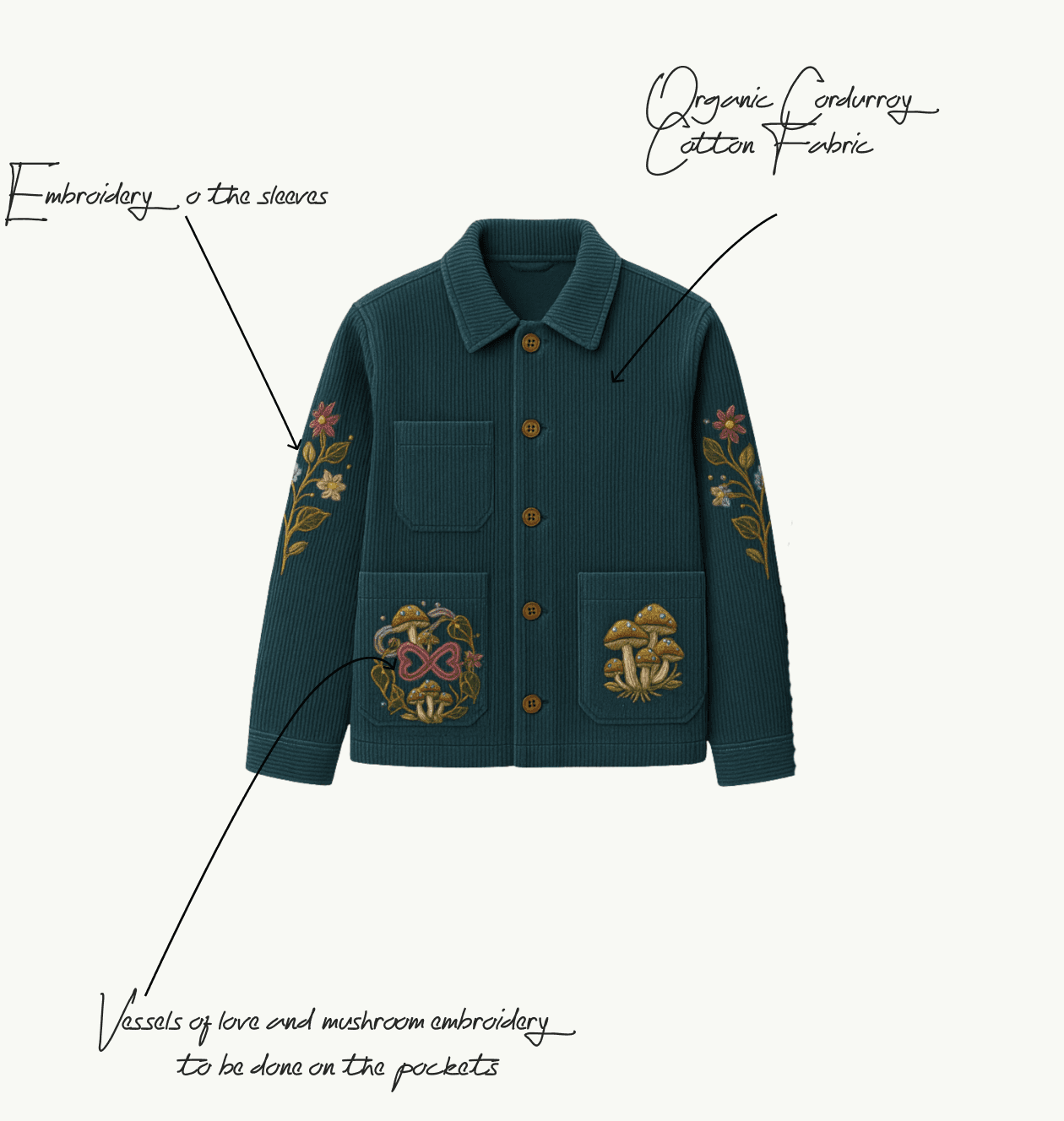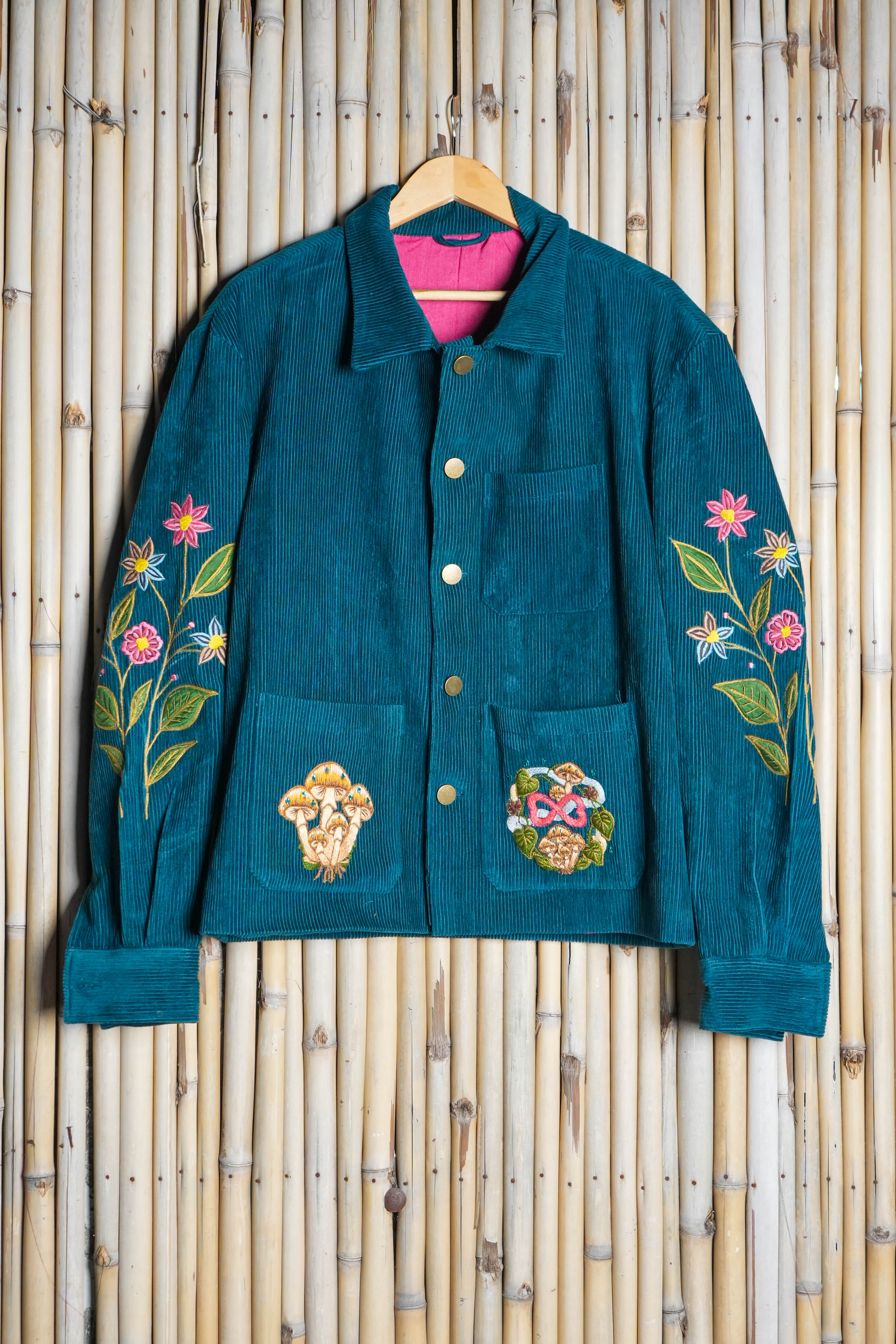 We shaped a relaxed, slightly cropped silhouette to highlight texture and motifs. Pocket placement and sleeve details frame the artwork naturally.