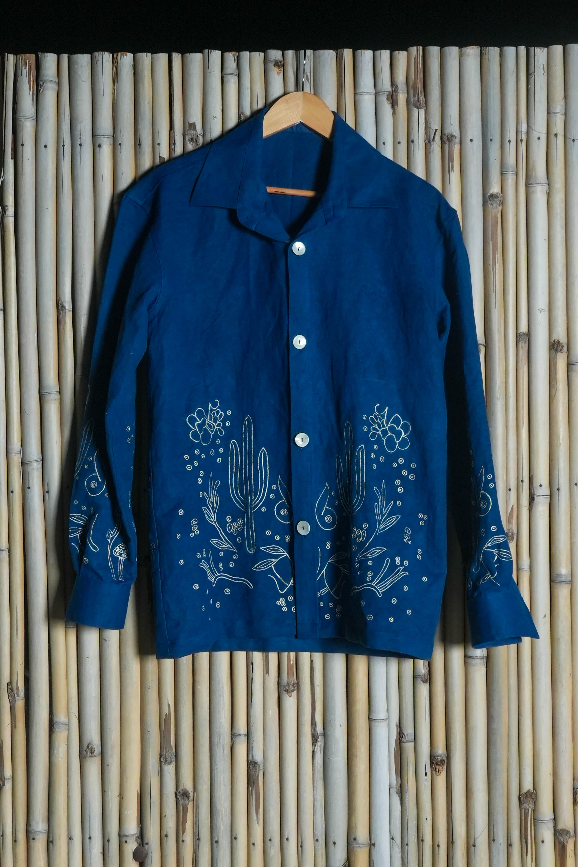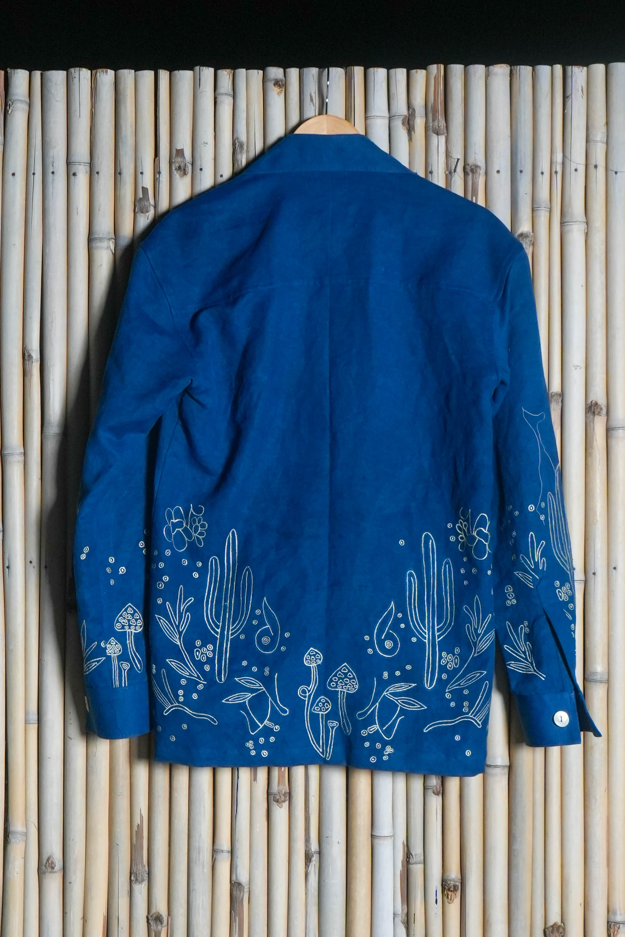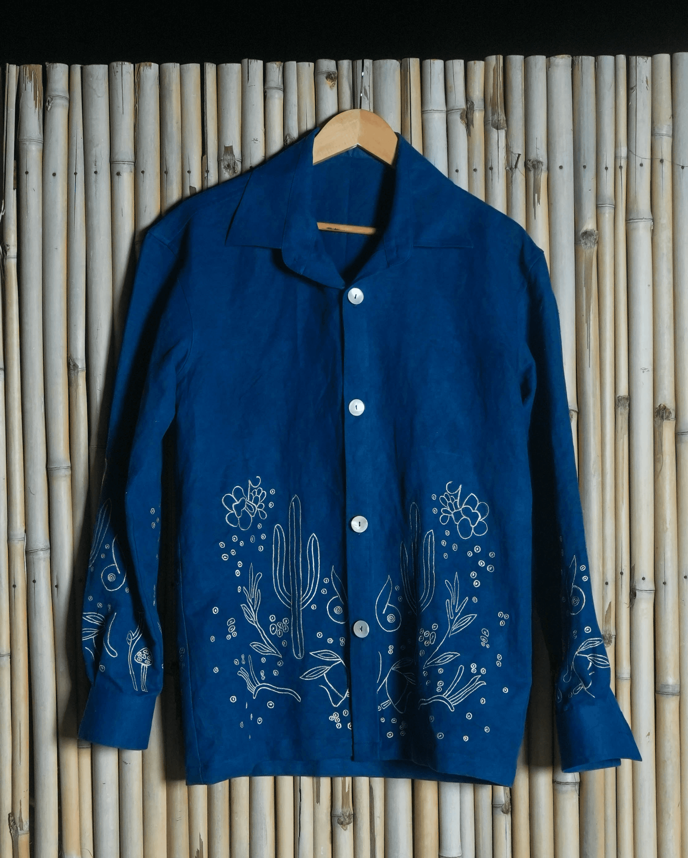 We shaped a relaxed shacket silhouette with crisp lines. The embroidery was placed to create a rising landscape around the body.