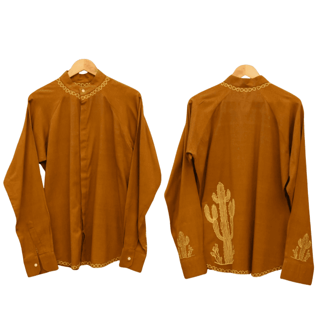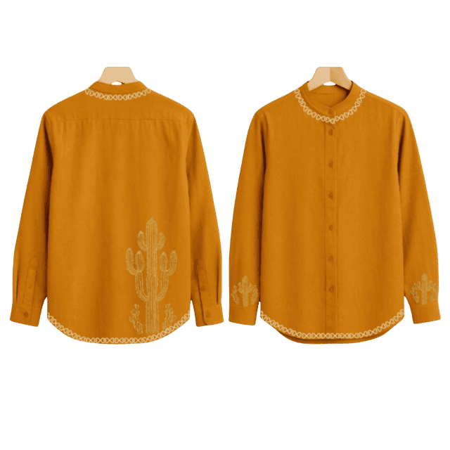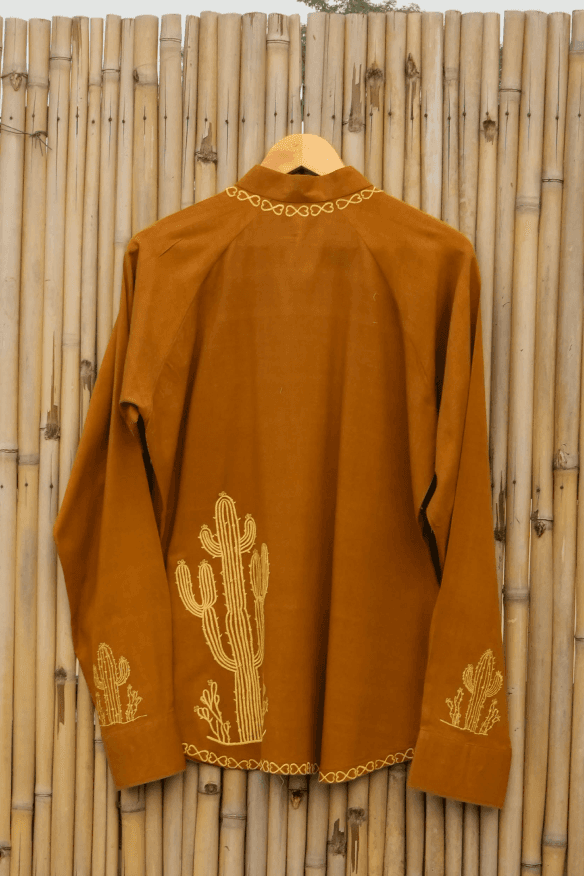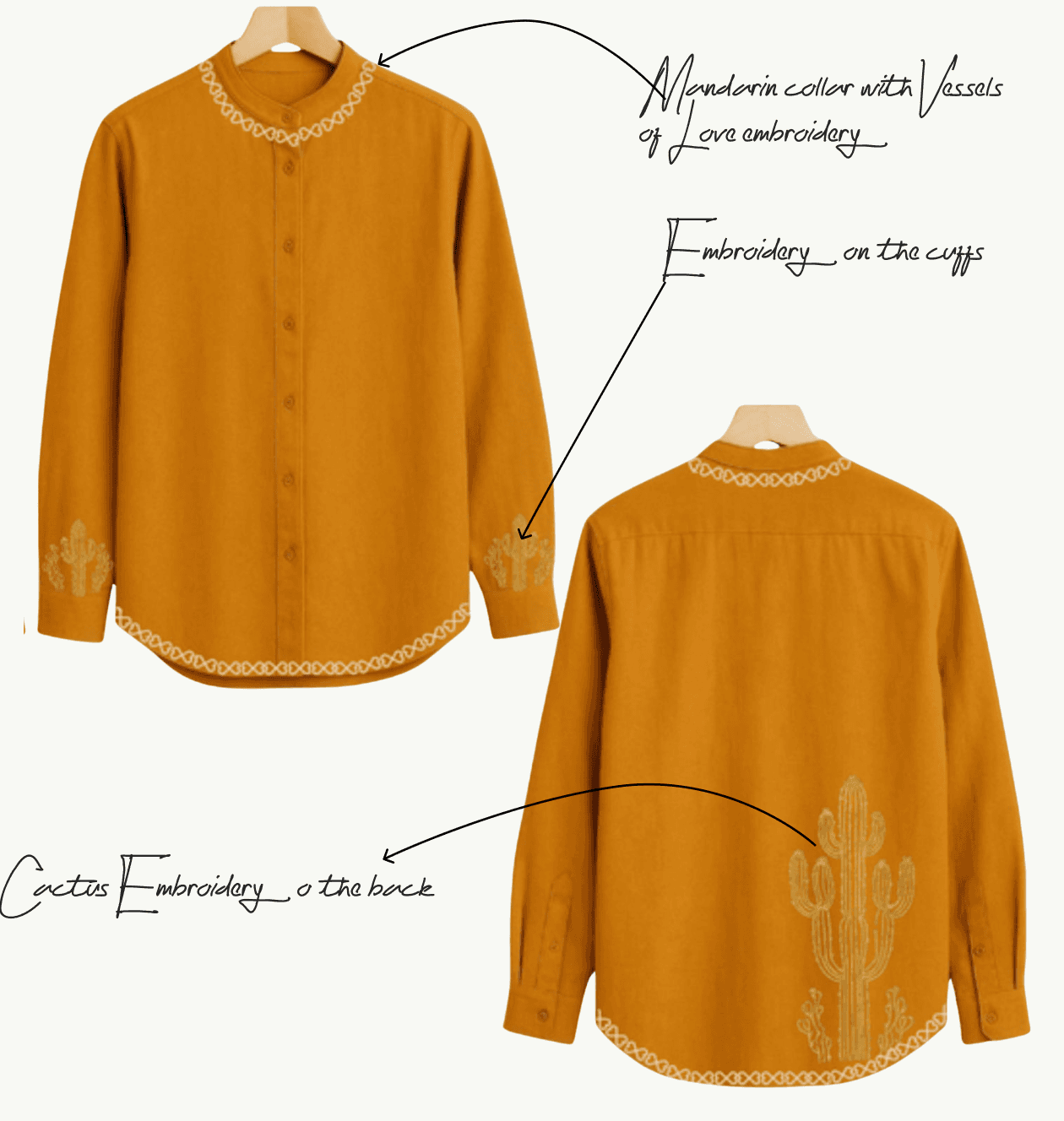 Ben envisioned a shirt that felt rooted in warmth—sun-baked earth tones, clean structure, and subtle hand embroidery that speaks softly yet confidently. He wanted a piece that echoed resilience and calm: something inspired by landscapes where stillness meets strength. The cactus motif became an emblem of endurance and quiet growth, a reminder that beauty thrives even in the harshest terrains.
