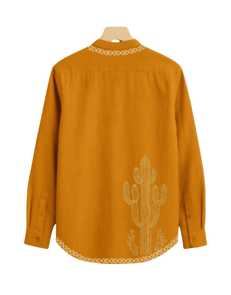 What emerges is a shirt that feels like the desert at golden hour—warm, composed, and full of quiet character. The banana cotton drapes softly, while the hand-embroidered cacti offer a touch of storytelling rooted in resilience.
