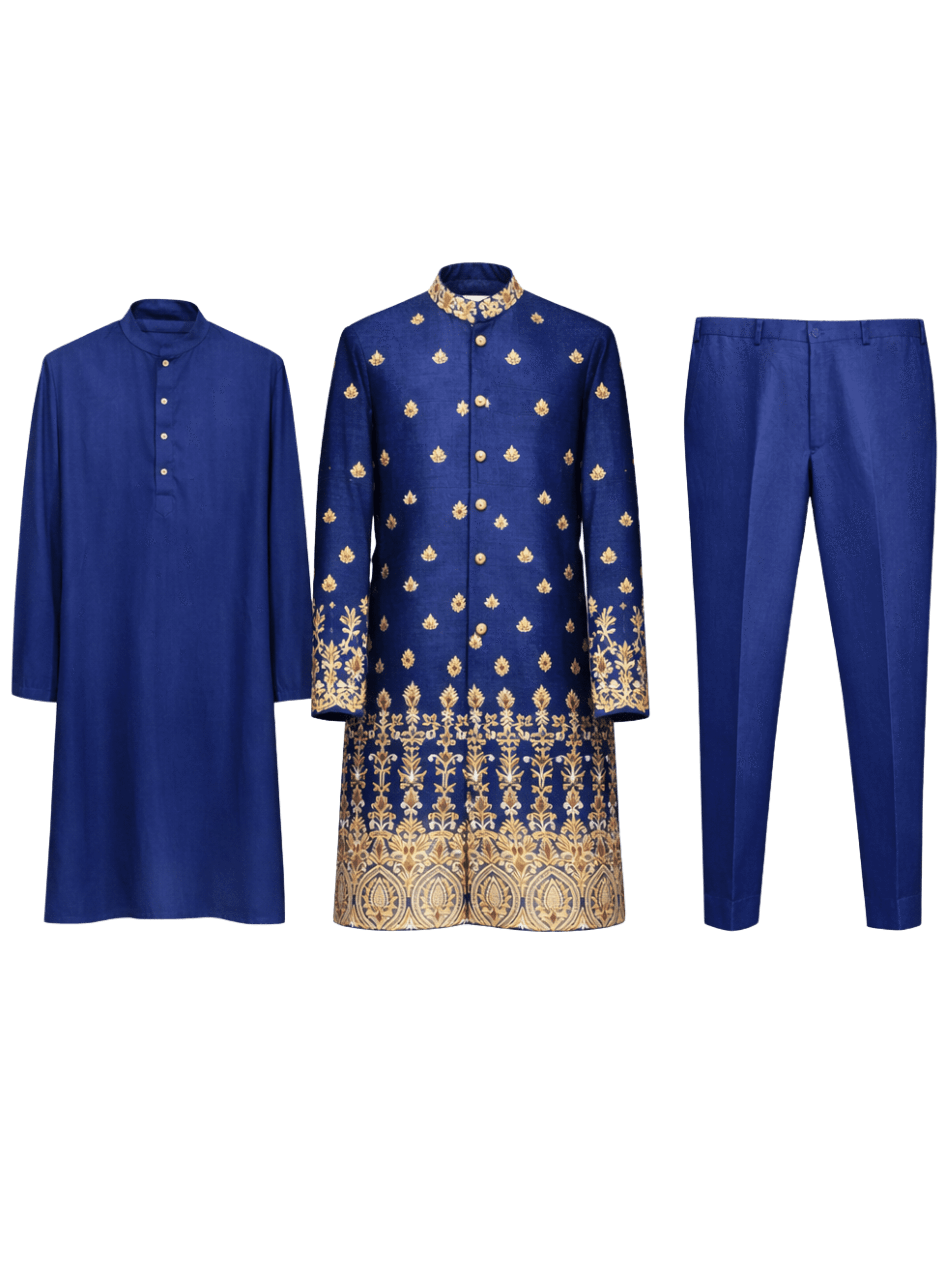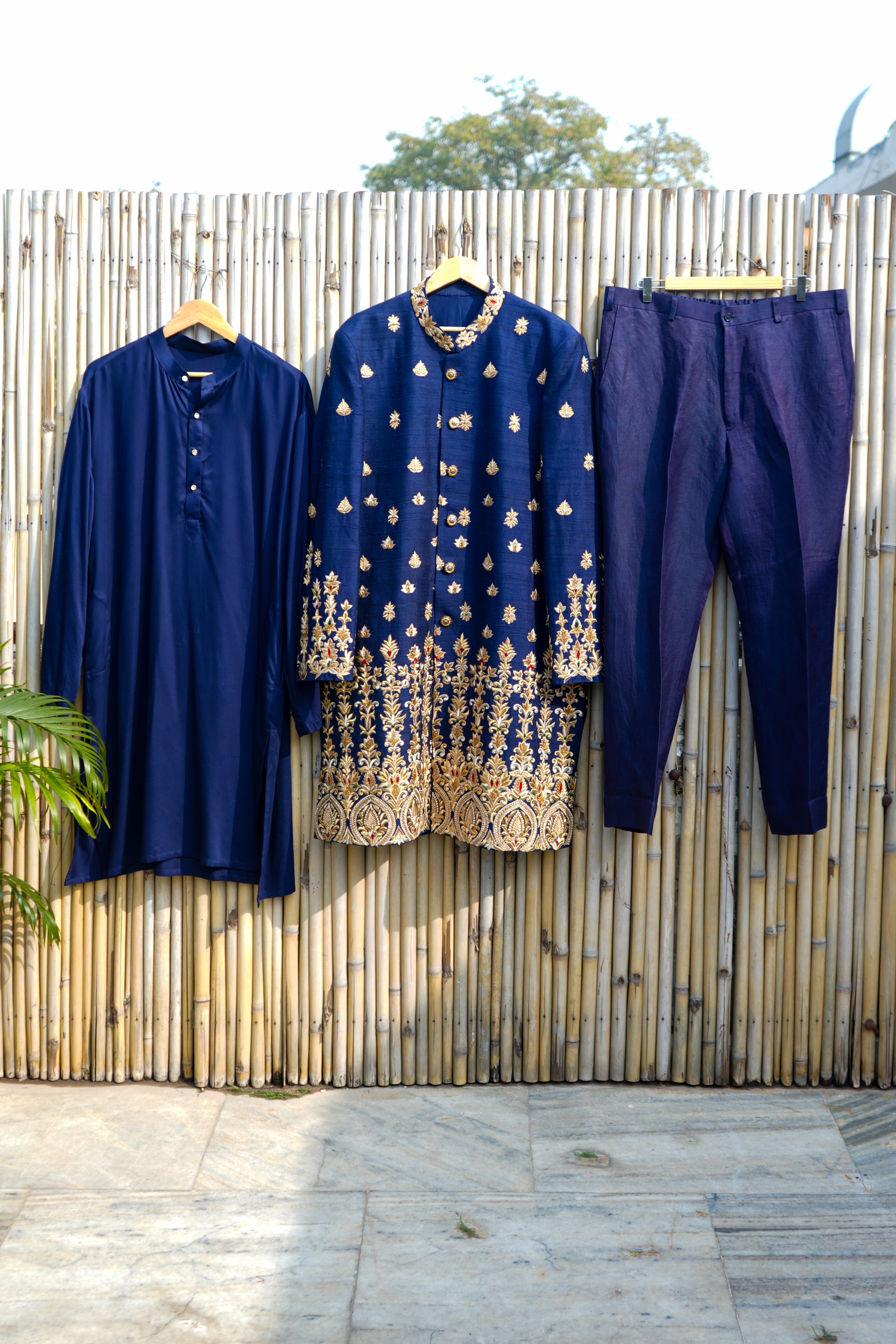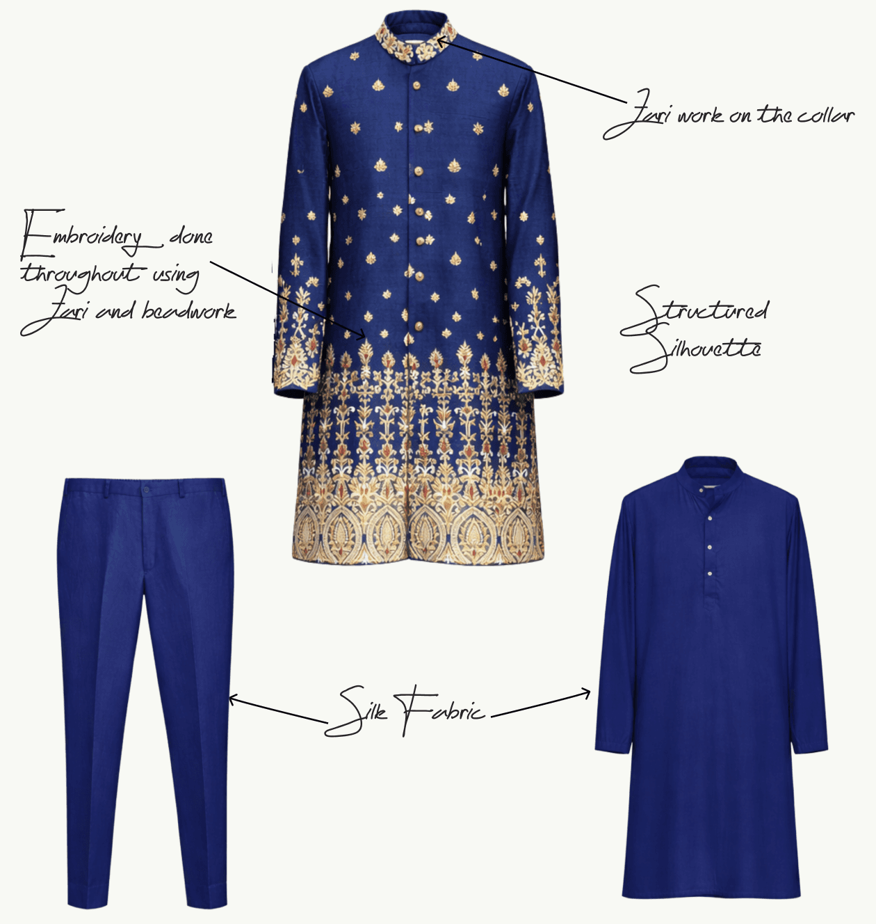 Designed for a wedding moment steeped in meaning, this ensemble brings together quiet grandeur and timeless elegance. The vision was to create something ceremonial yet refined, rich in detail without overwhelming the wearer.