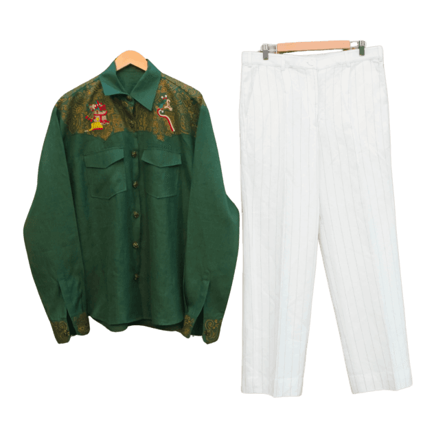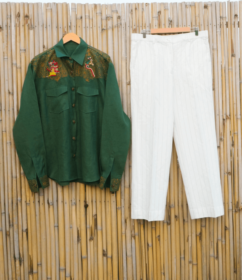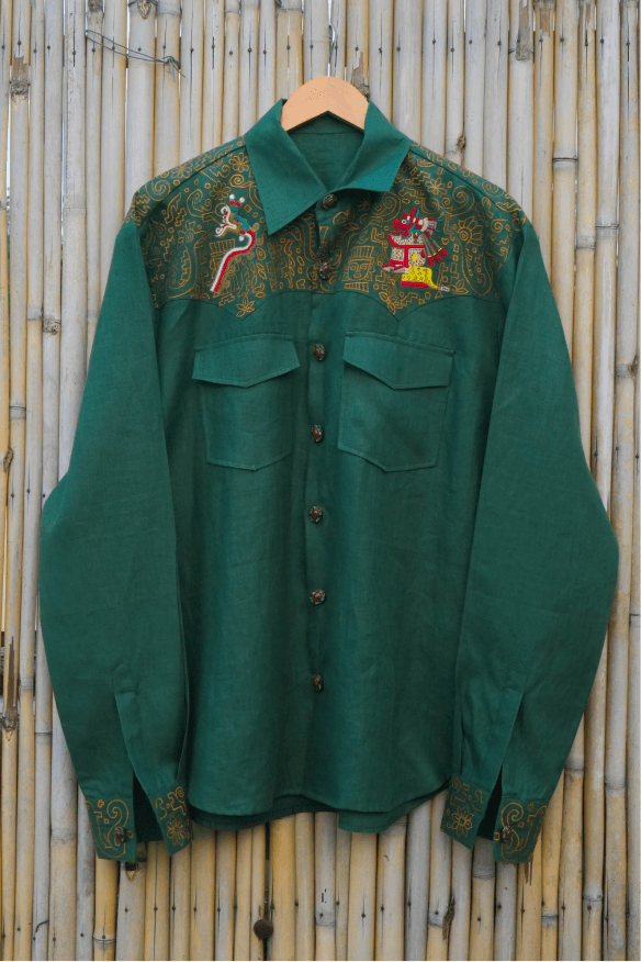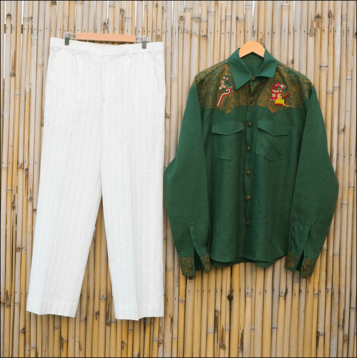 Japhet’s Aztec Warrior Set emerges as a striking fusion of ancient strength and modern elegance. The deep green shirt stands as a canvas of mythology, while the cream pinstripe pant keeps the look balanced and suave. Together, they form an ensemble that glows beautifully at sundown—quietly fierce, rooted, and unmistakably unique.