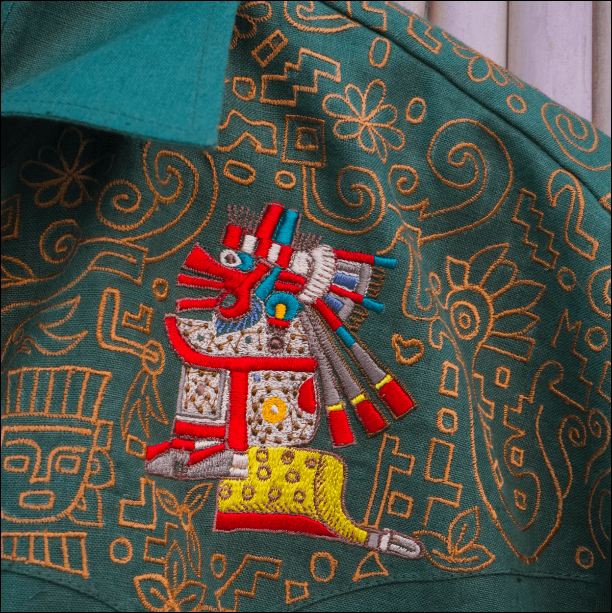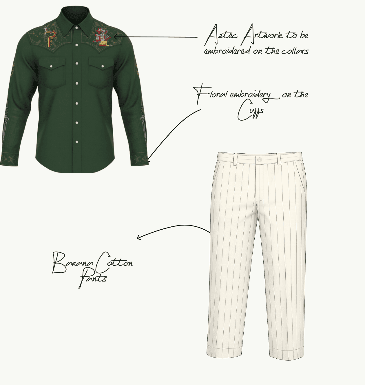 Tailors shaped the hemp fabric to maintain a strong yet comfortable silhouette. Then, embroidery artists translated Aztec motifs into precise digital stitch patterns. Each line, curve, and symbol was executed with clarity, ensuring the warrior imagery feels powerful without overpowering. The pinstripes on the trousers were aligned with care to keep the look clean and modern.