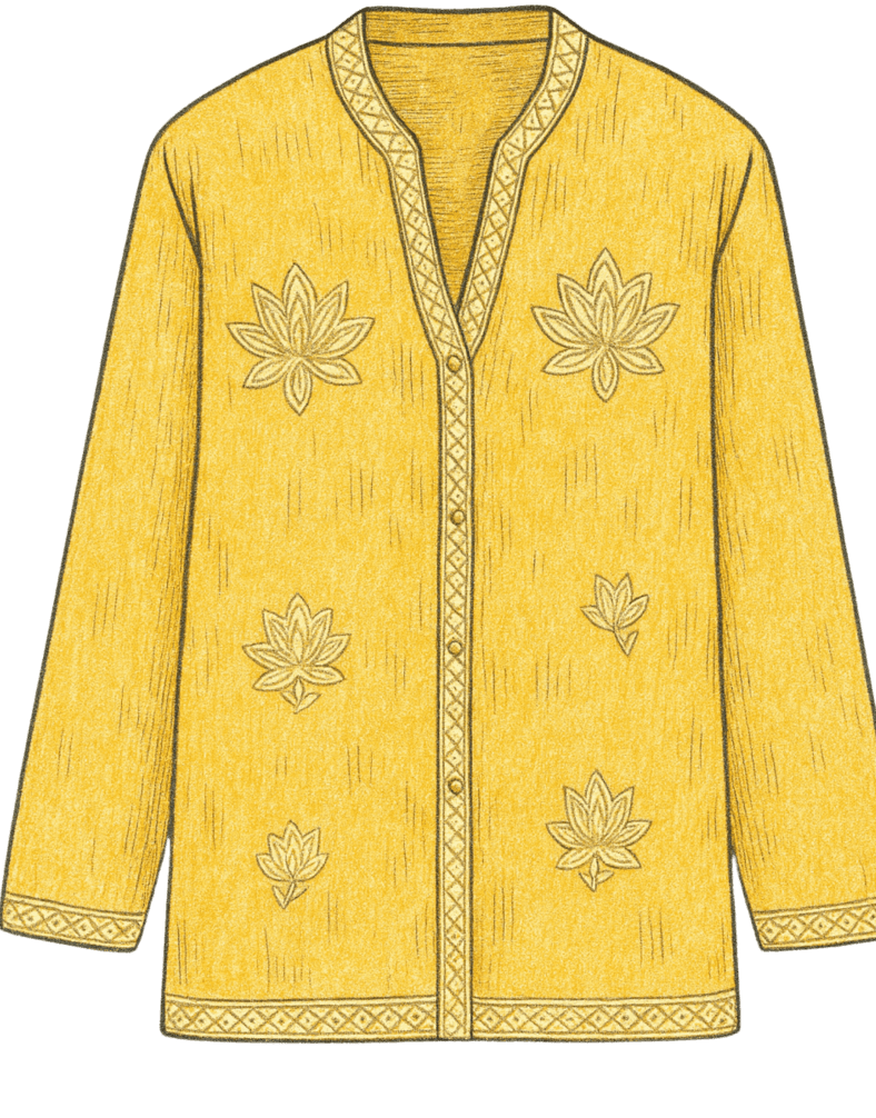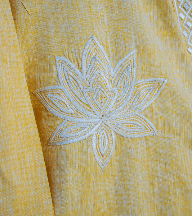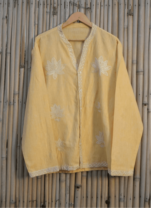 Once your vision settled into its exact form, our artisans began their quiet choreography—marking embroidery points, guiding the machine needle with expert precision, and ensuring the lotus motifs bloom evenly across the garment. The hemp–cotton fabric was treated gently, allowing its natural texture to remain intact, and each seam was stitched with intention and care.