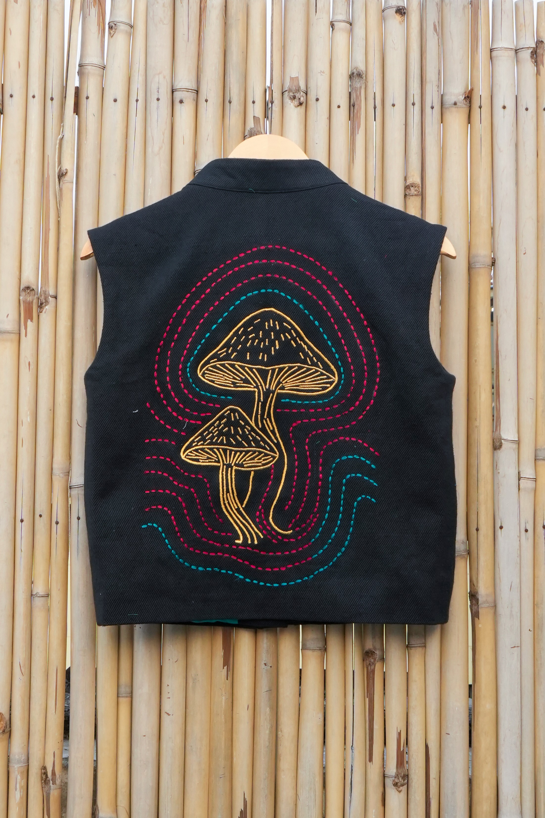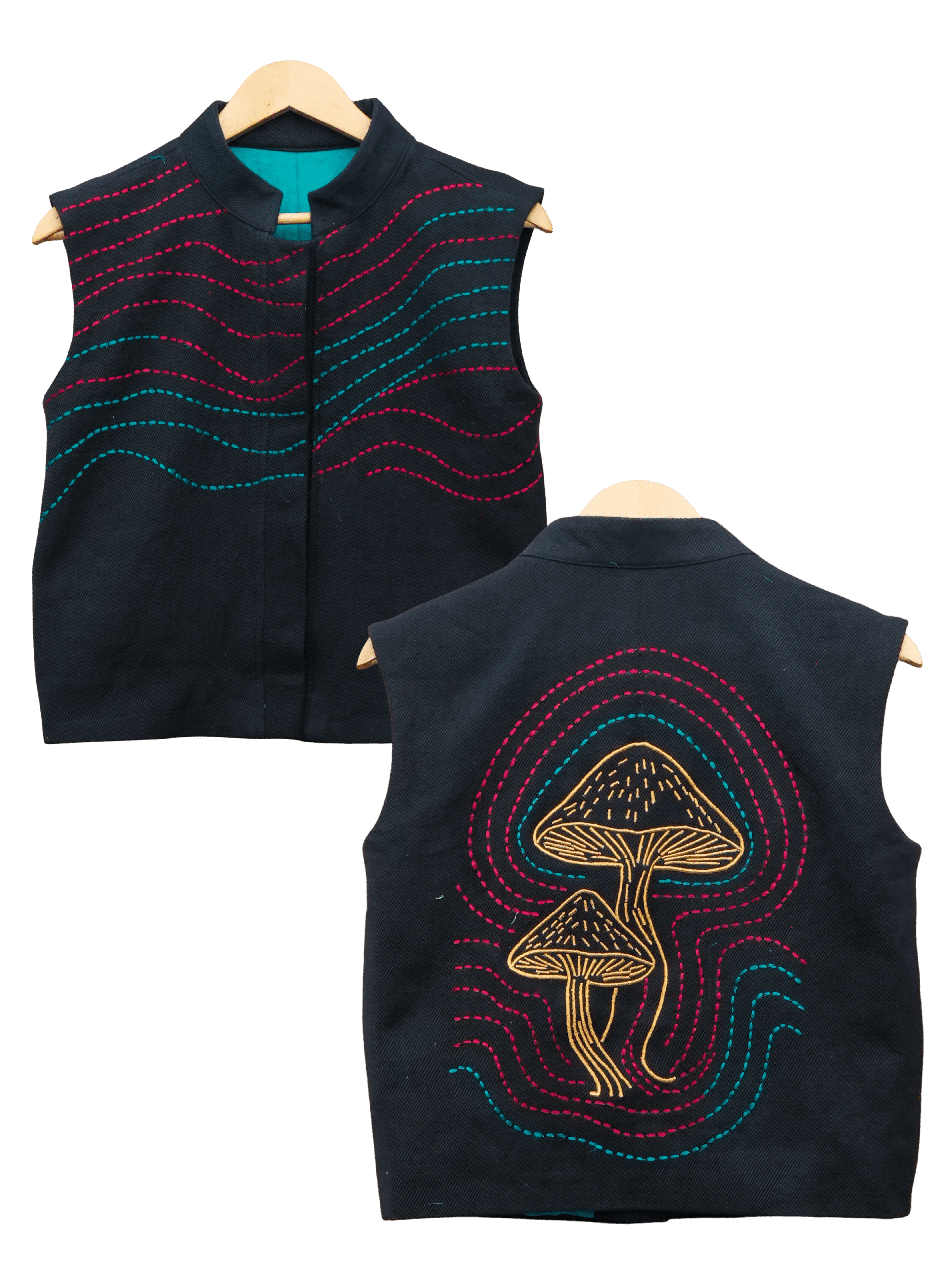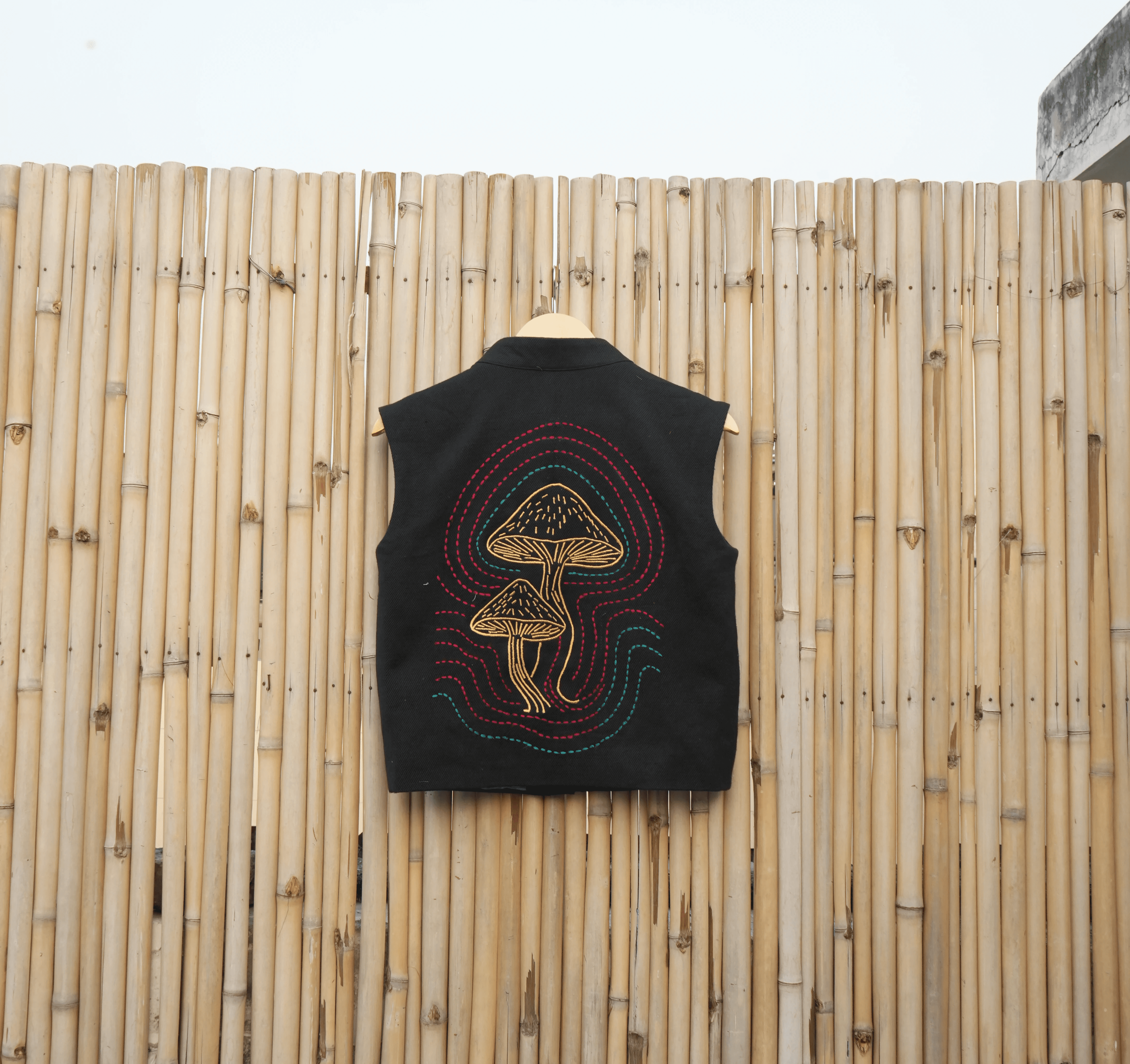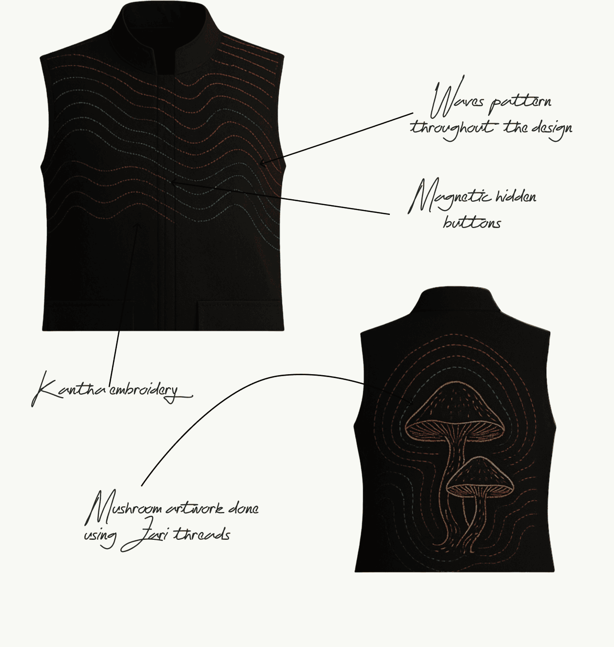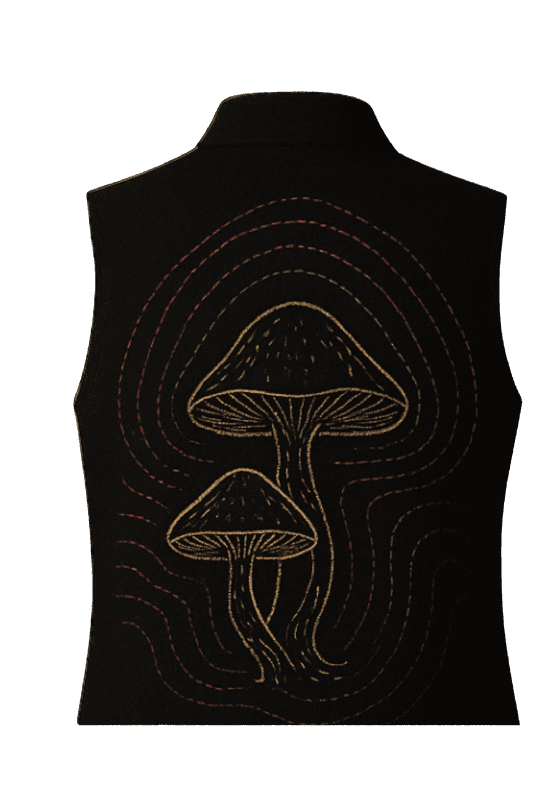 Jay imagined a vest that reflects quiet resilience and inner growth. Inspired by mushrooms, the design celebrates what thrives beneath the surface—patient, interconnected, and powerful.
