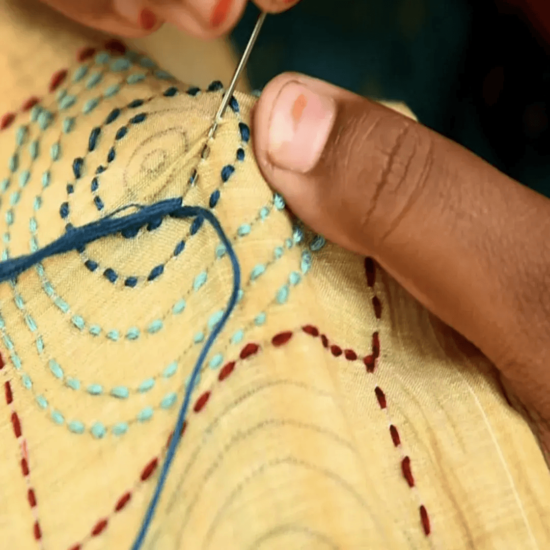 Artisans worked patiently with the khadi, letting the fabric guide the embroidery. Every stitch carries subtle variations, marking the presence of the maker.