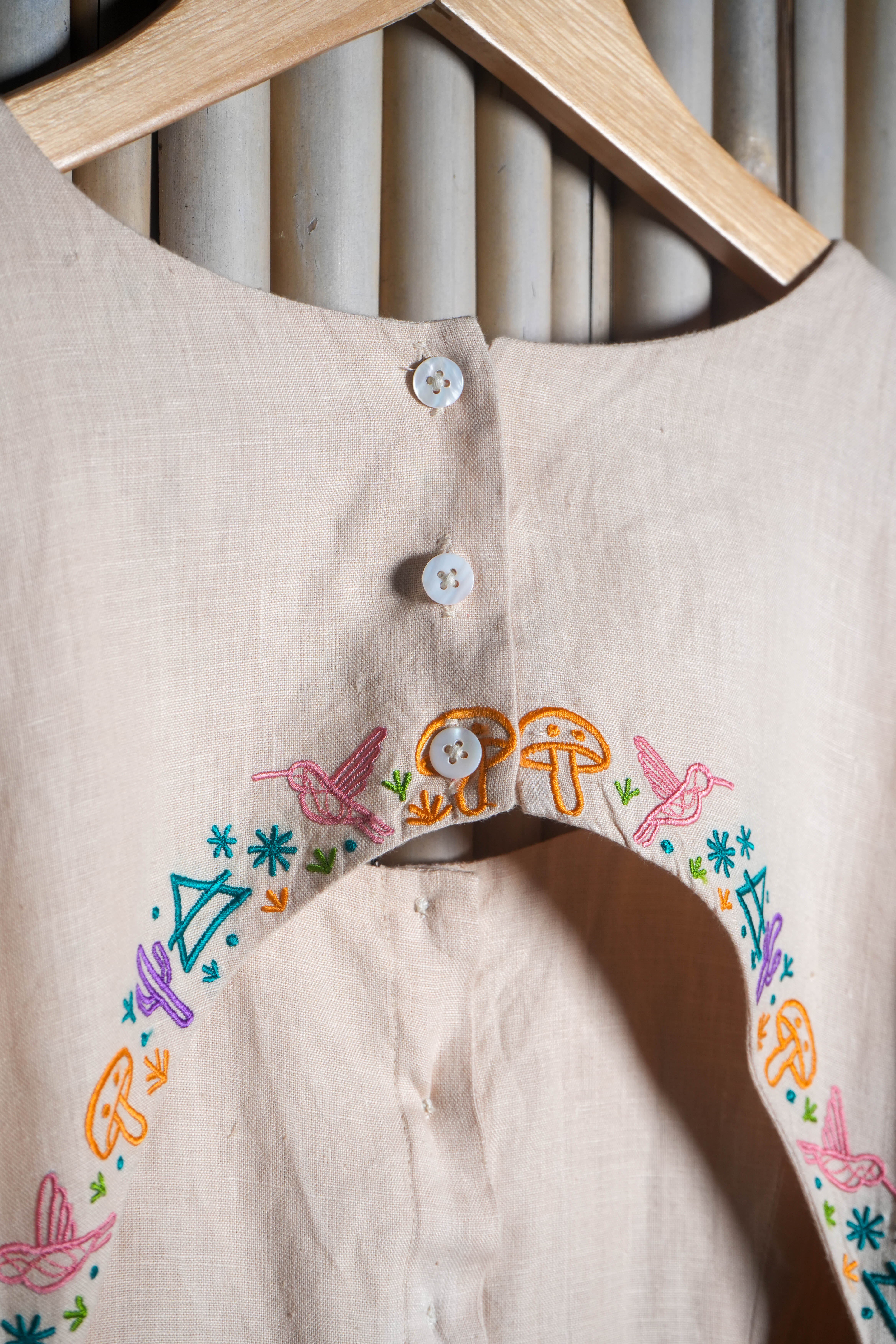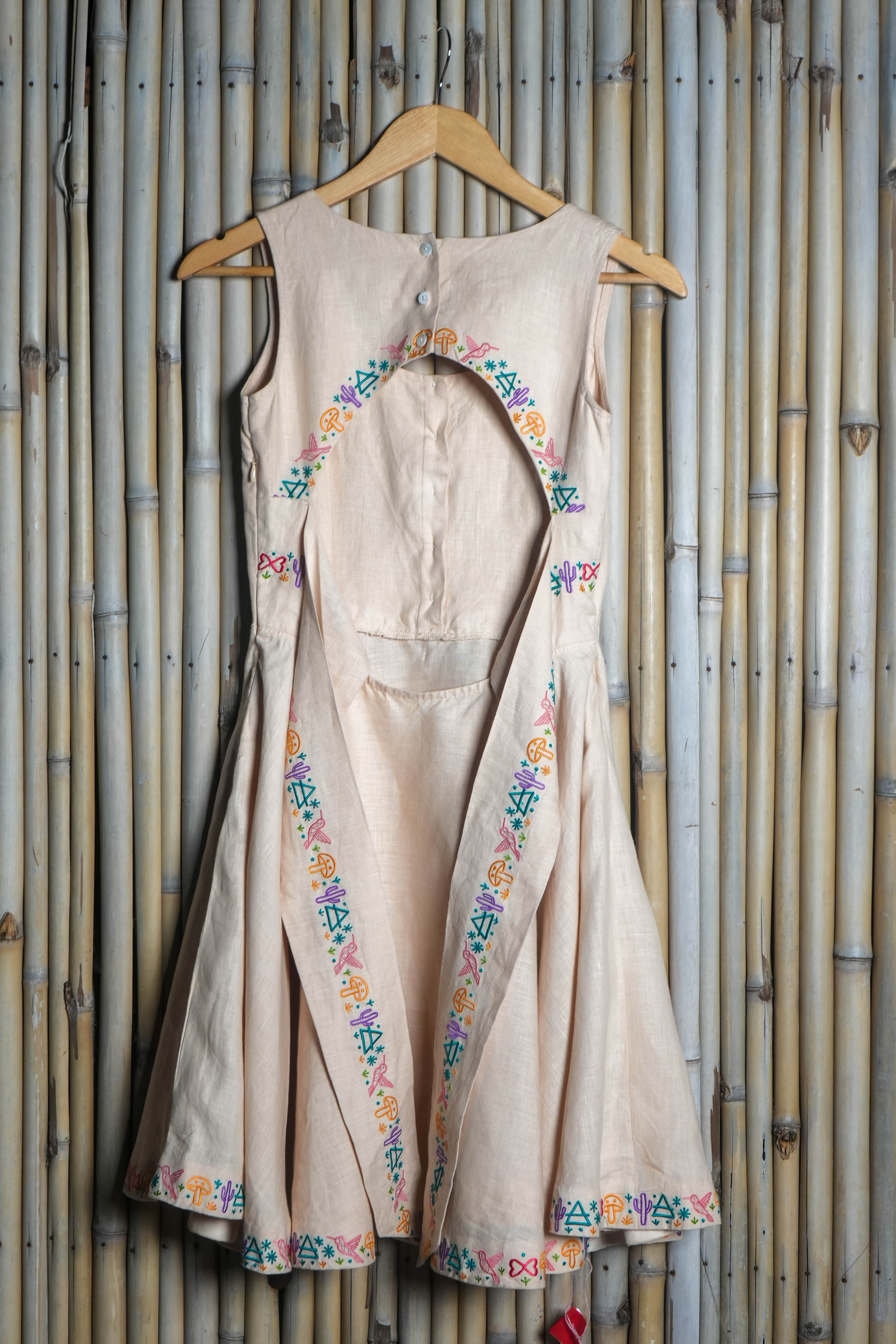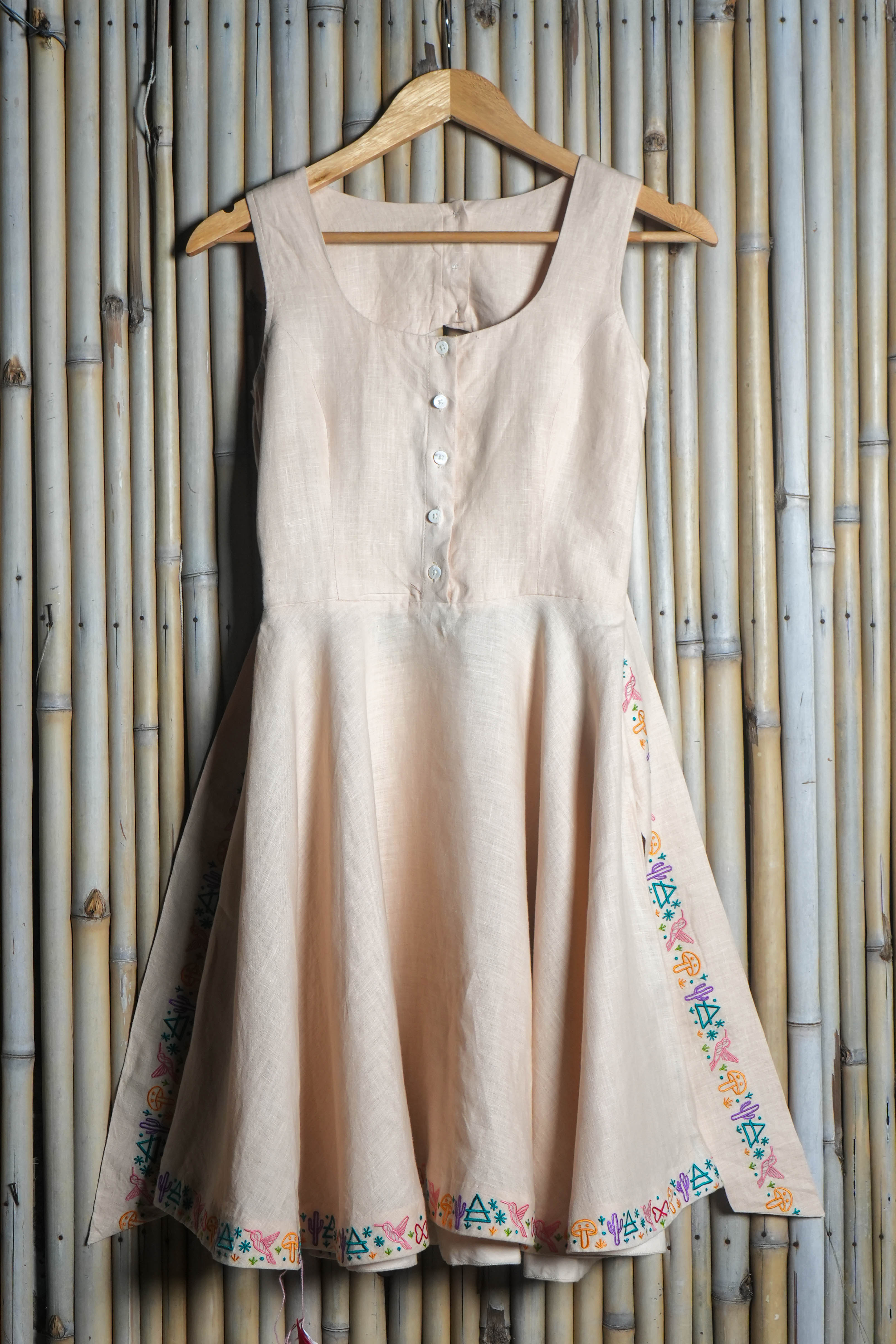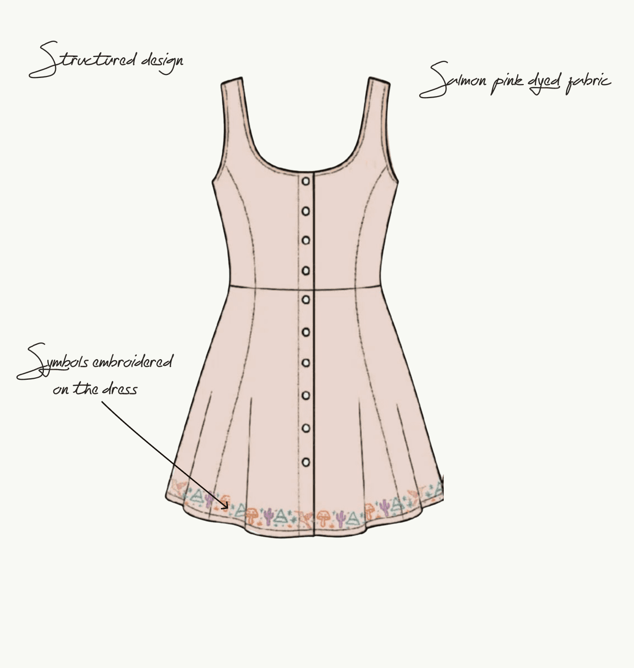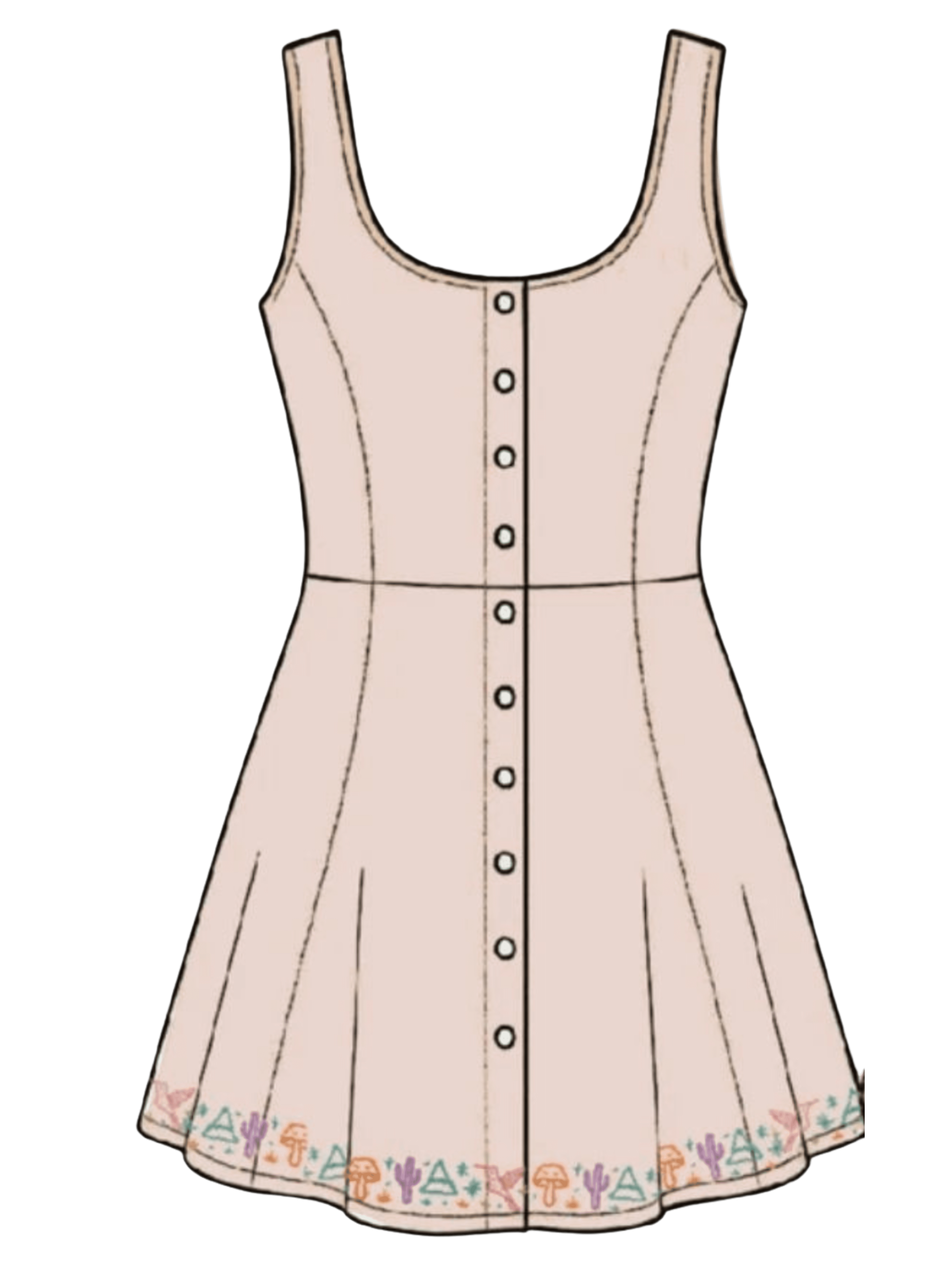 We shaped a sleeveless, flared silhouette that twirls easily and flatters the body. The embroidery was placed to highlight movement around the hem.