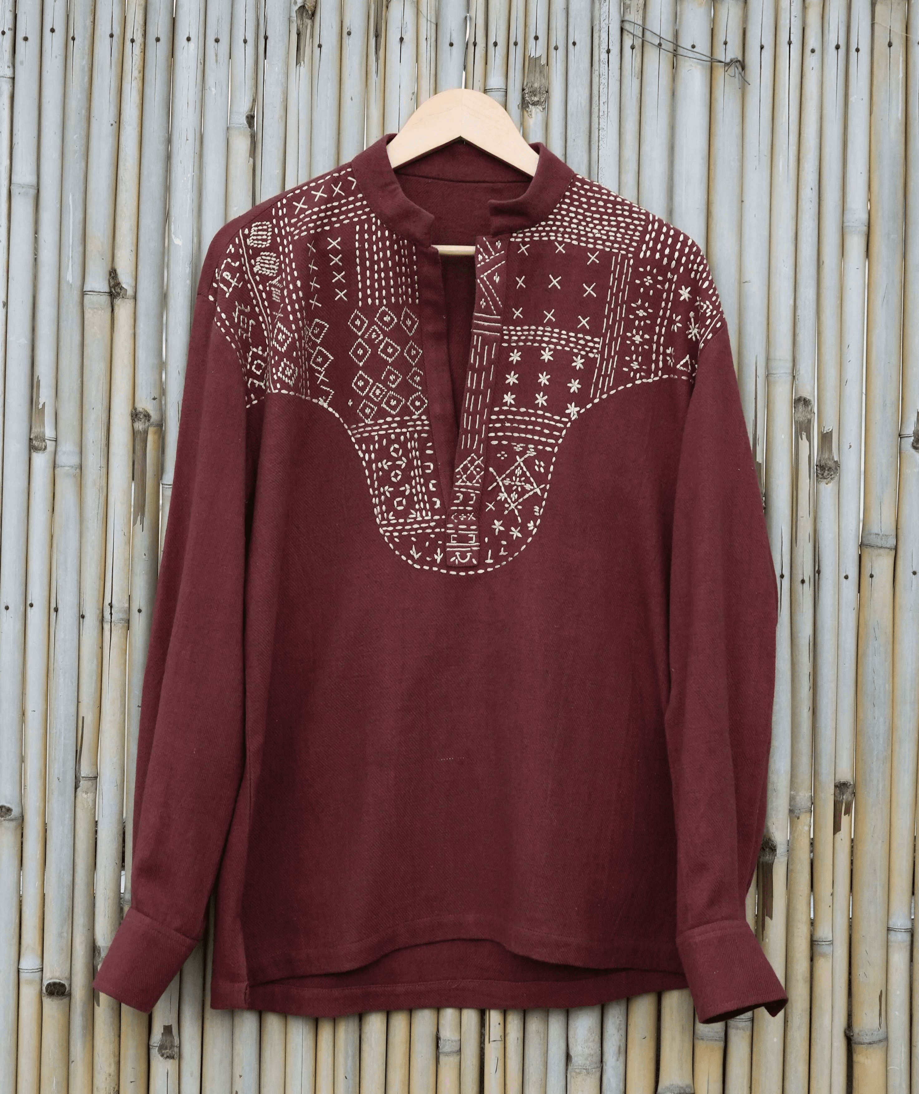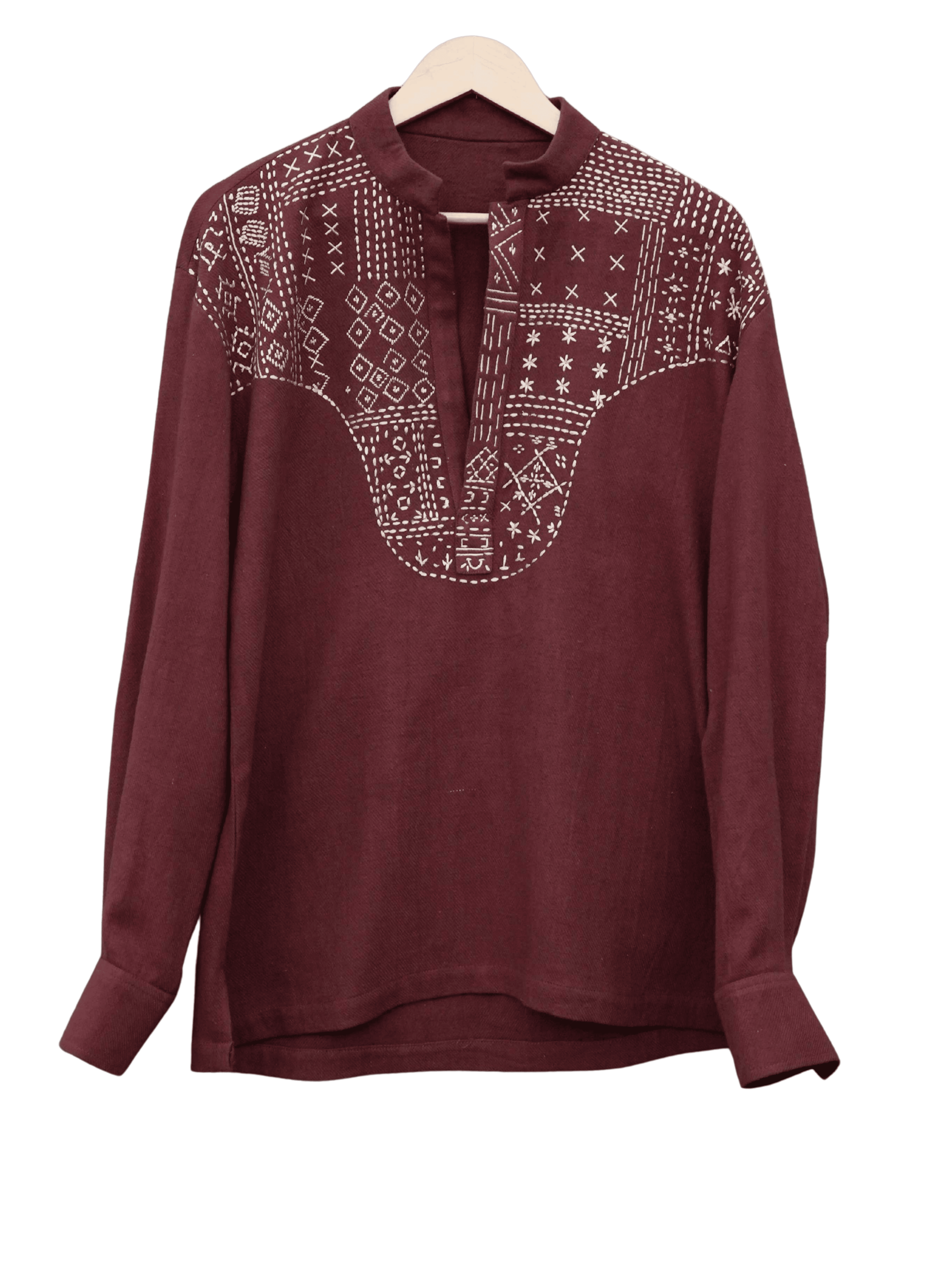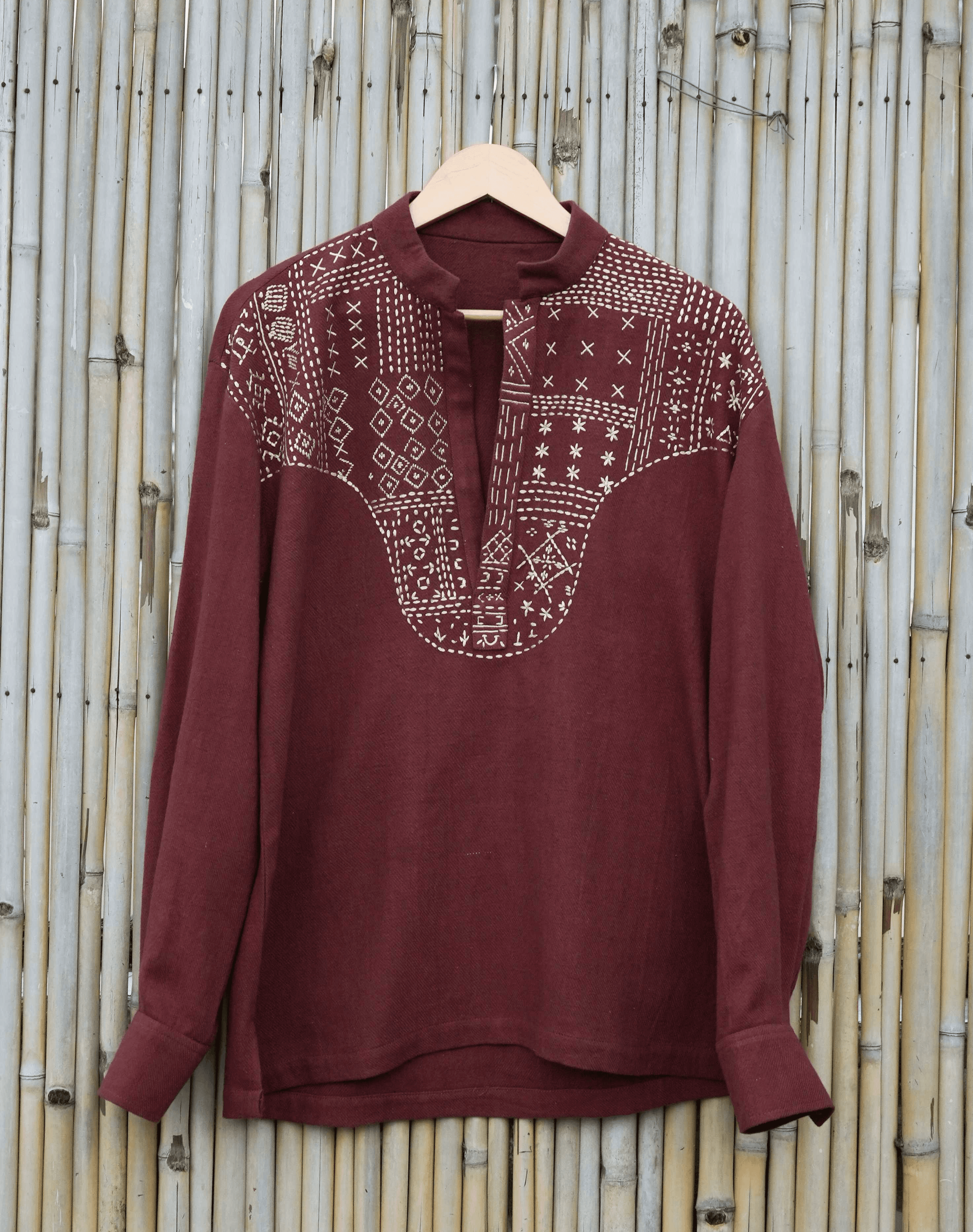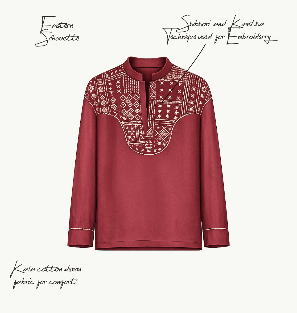 This kurta is rooted in eastern craft traditions, drawing from slow handwork and symbolic patterns. The vision was to create a piece that feels grounded and wearable, while quietly carrying stories of hand, time, and technique.