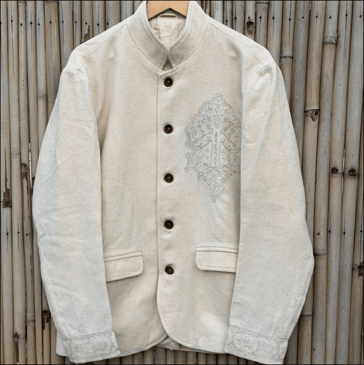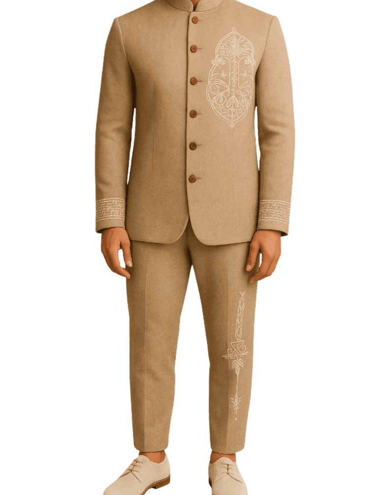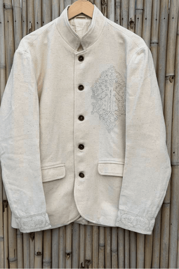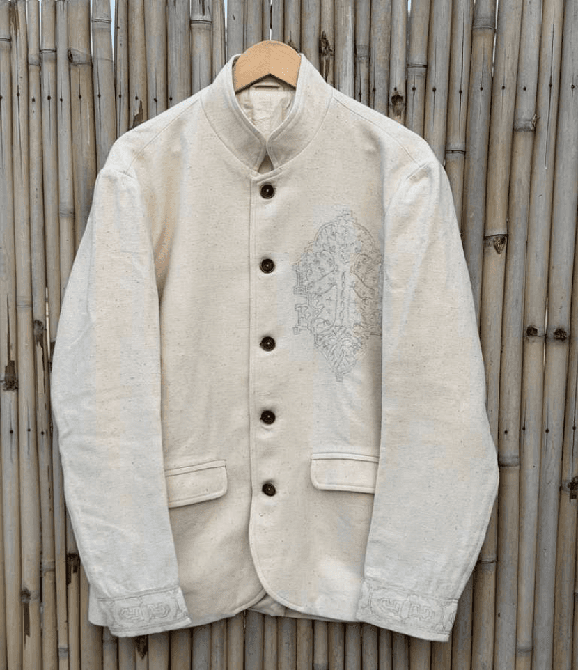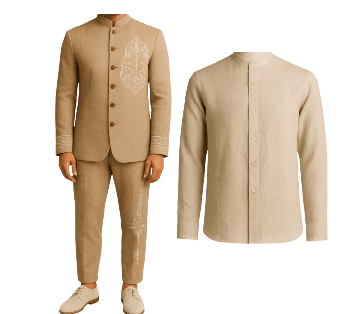 A handwoven, hand-embroidered ceremonial bandhgala crafted in natural hues, embodying quiet elegance for Todd’s intimate backyard wedding.