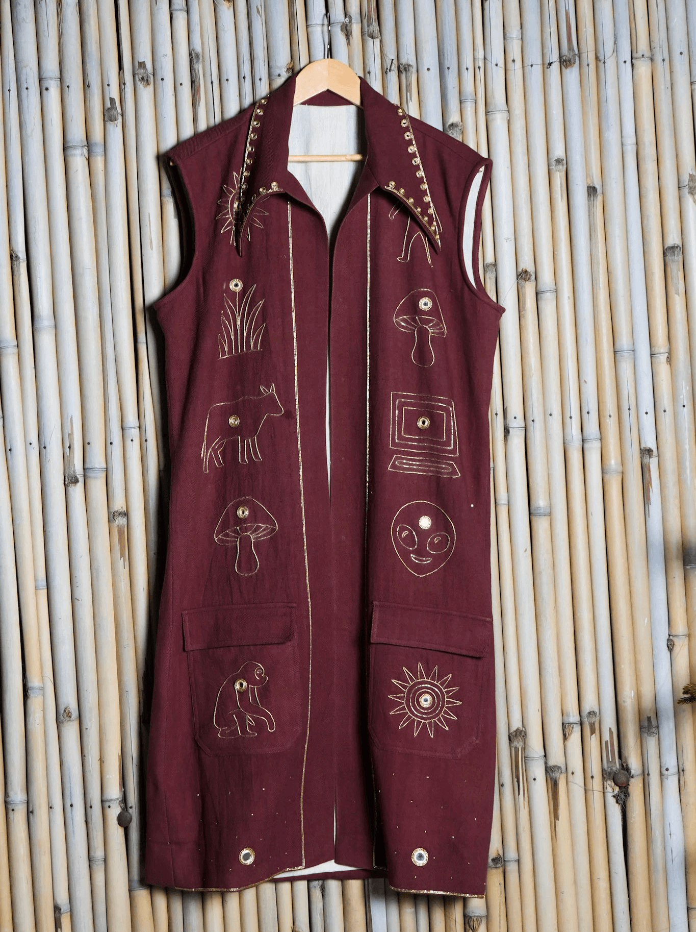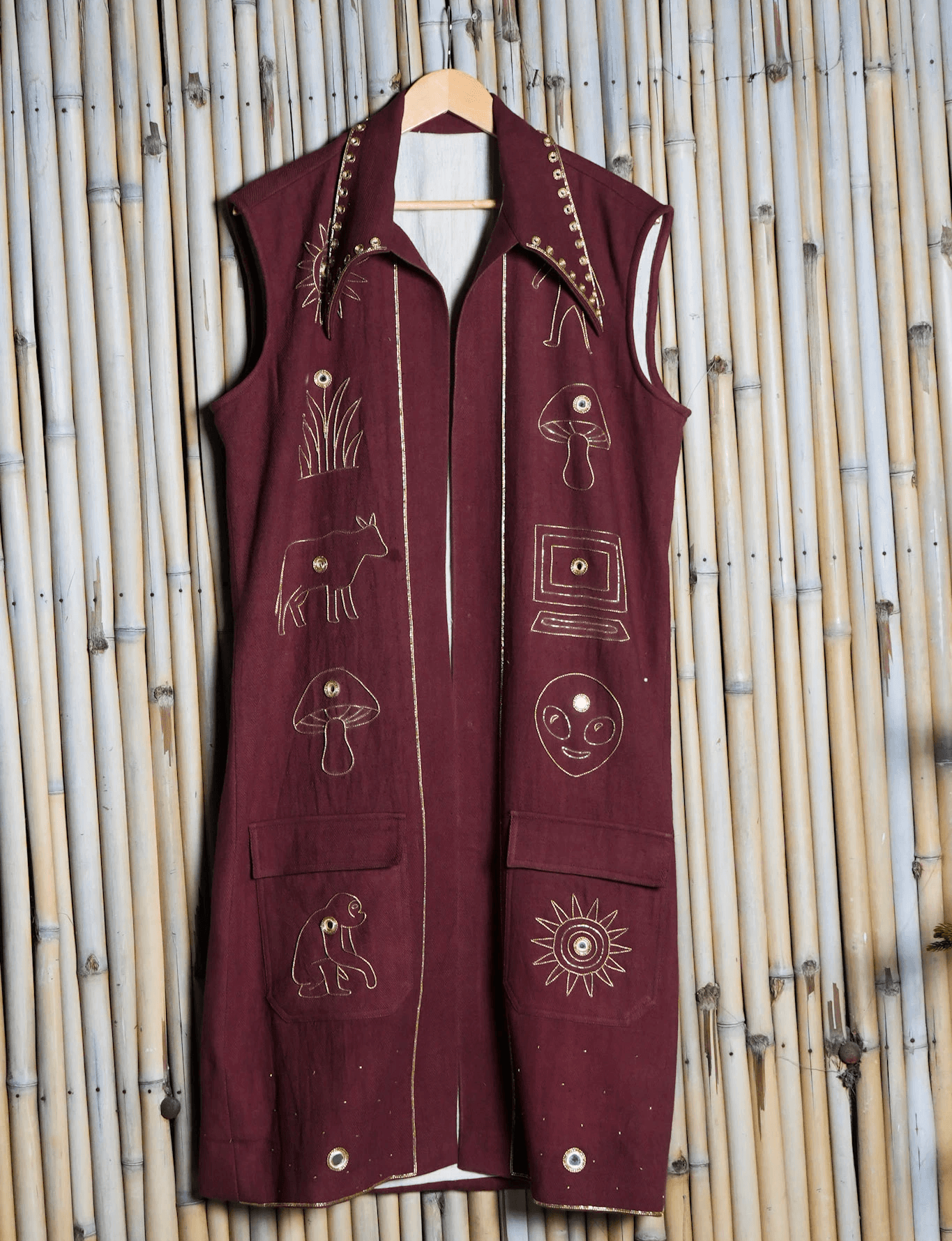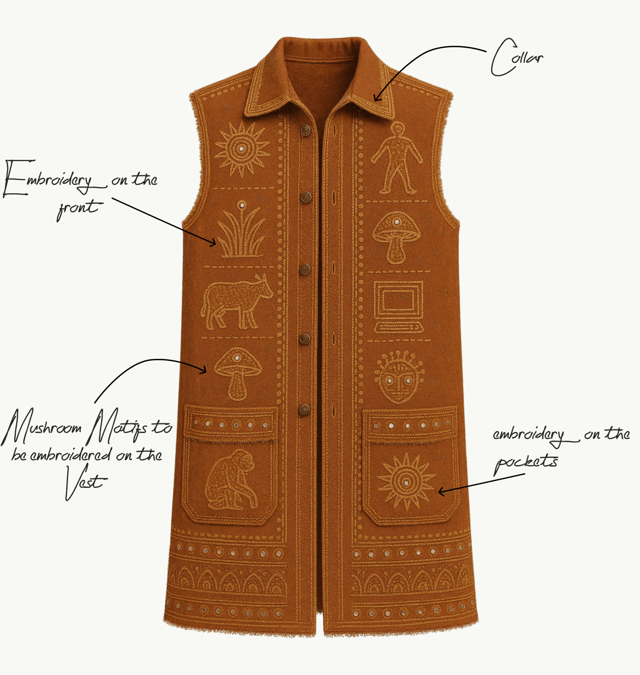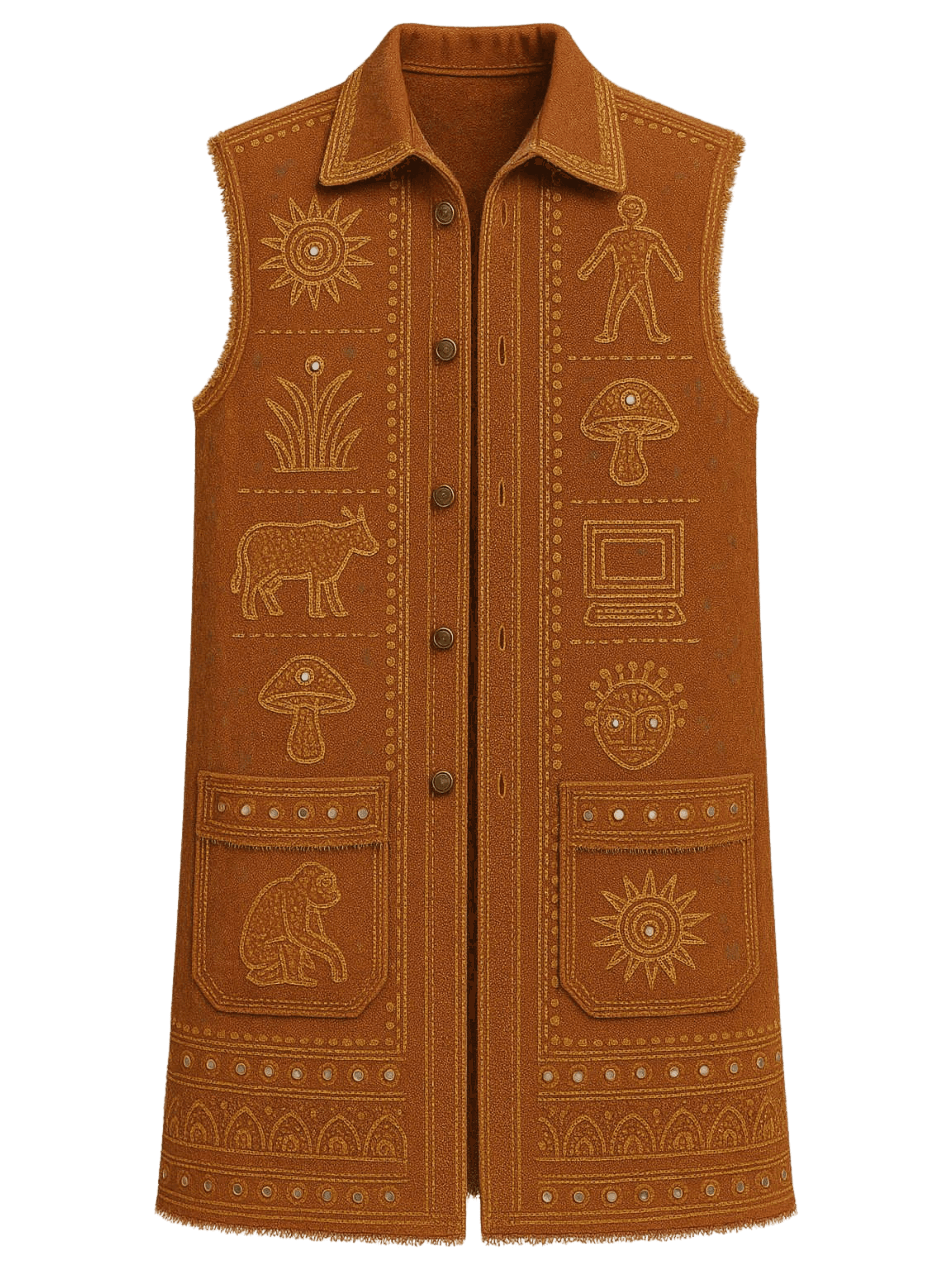 The vest was envisioned as an open canvas—long, sleeveless, and structured enough to frame the body without restricting it. Pockets were placed not just for function, but as visual anchors, allowing larger symbols to rest and breathe