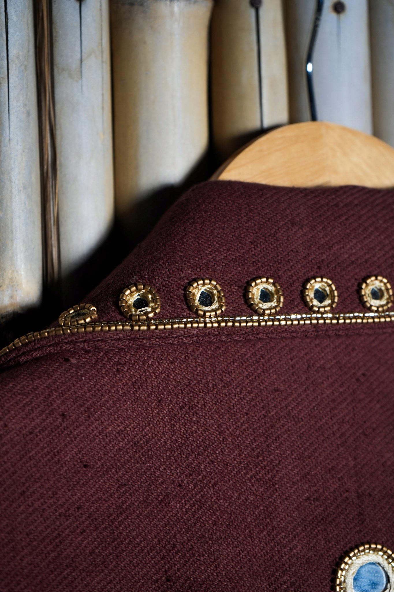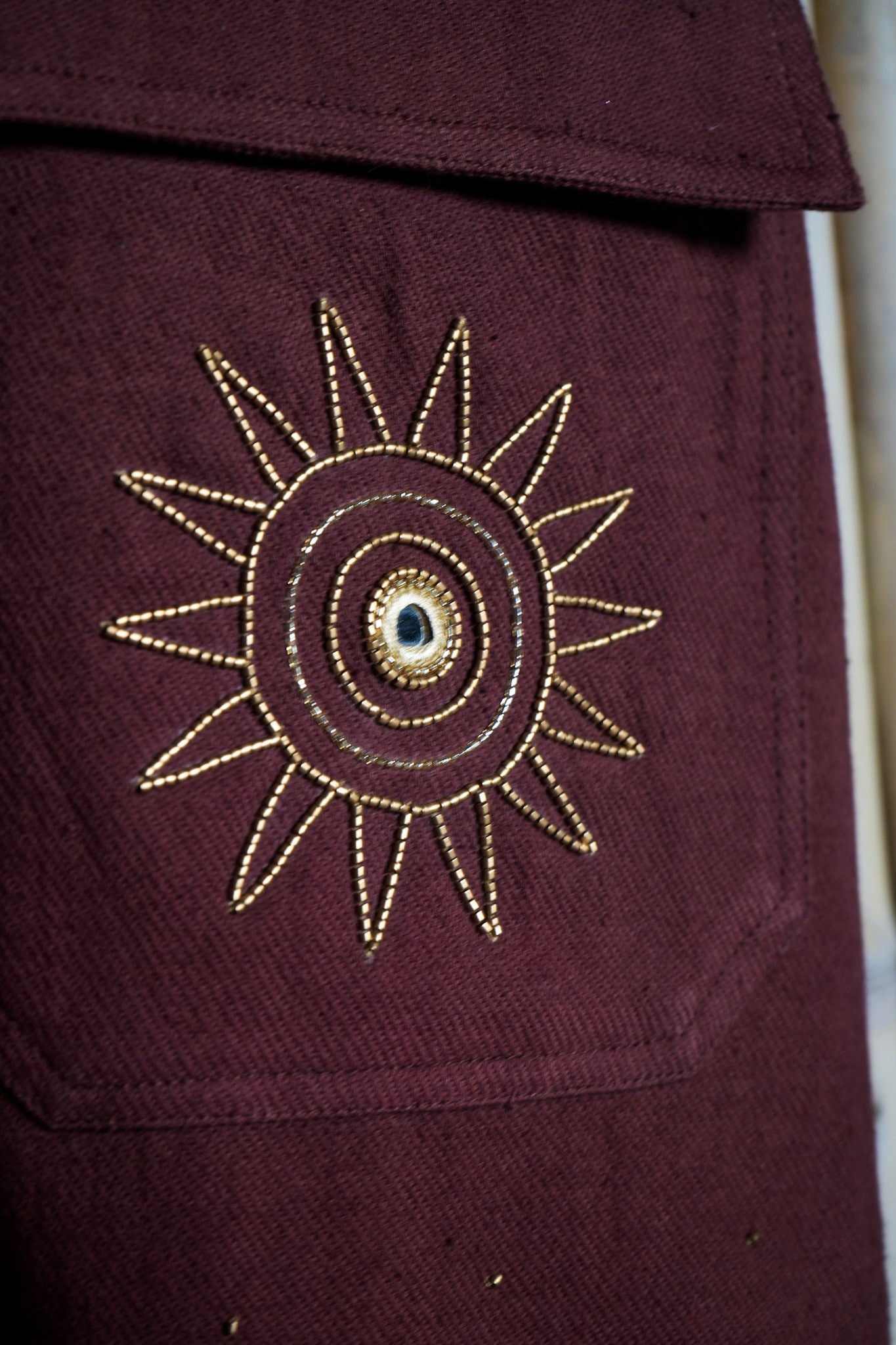 Artisans translated the sketches into thread, working slowly, motif by motif. Each symbol was embroidered by hand, allowing small variations to emerge—tiny reminders that this is not a replicated piece, but a singular one.