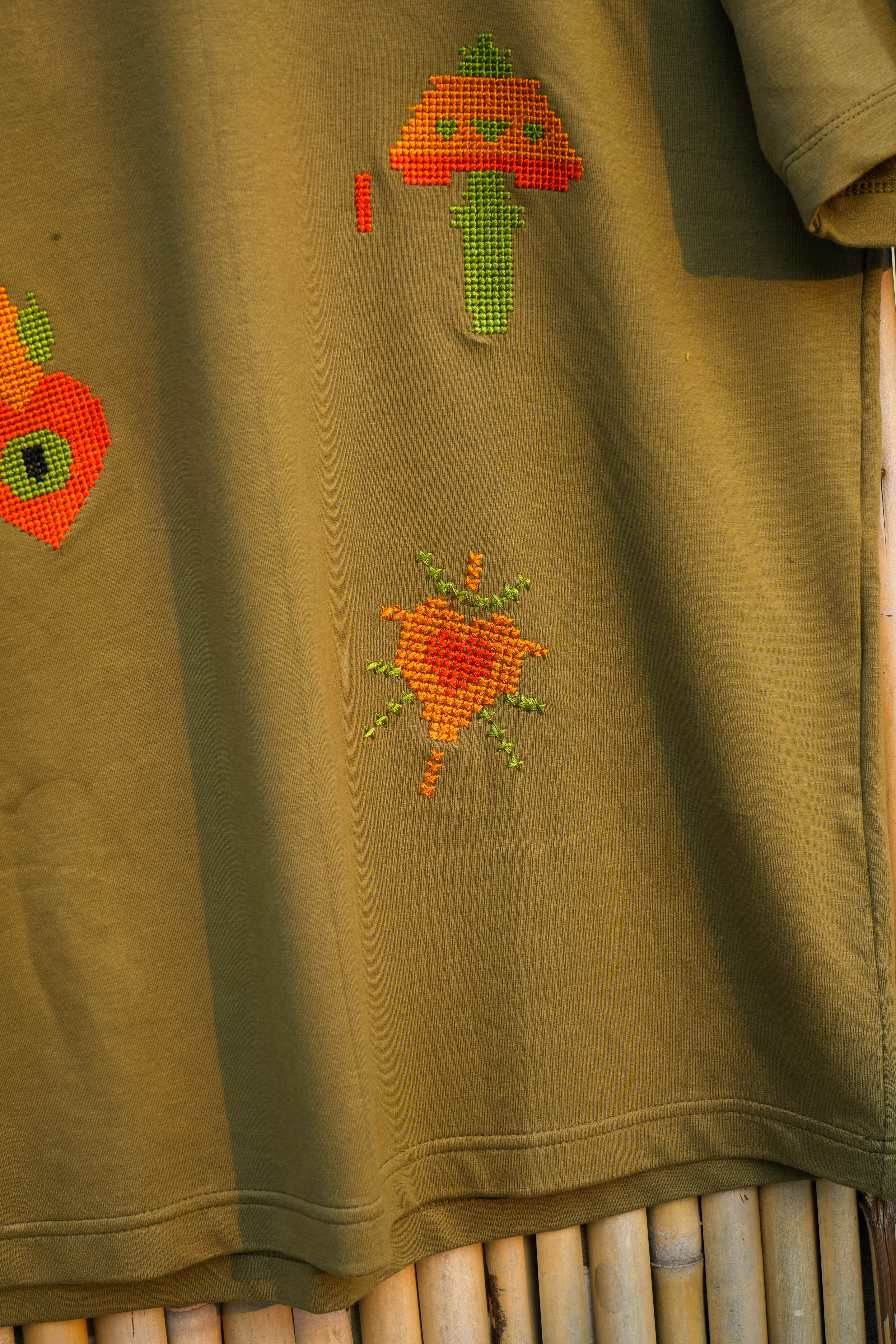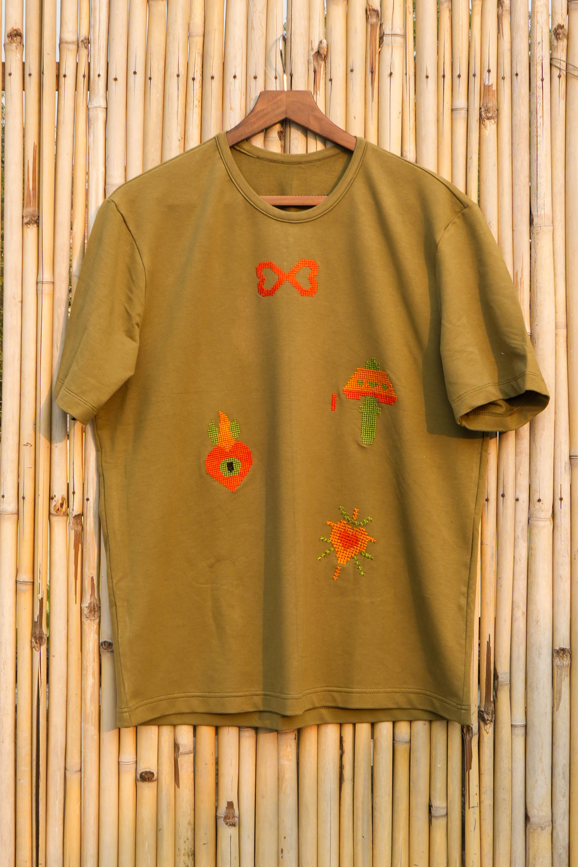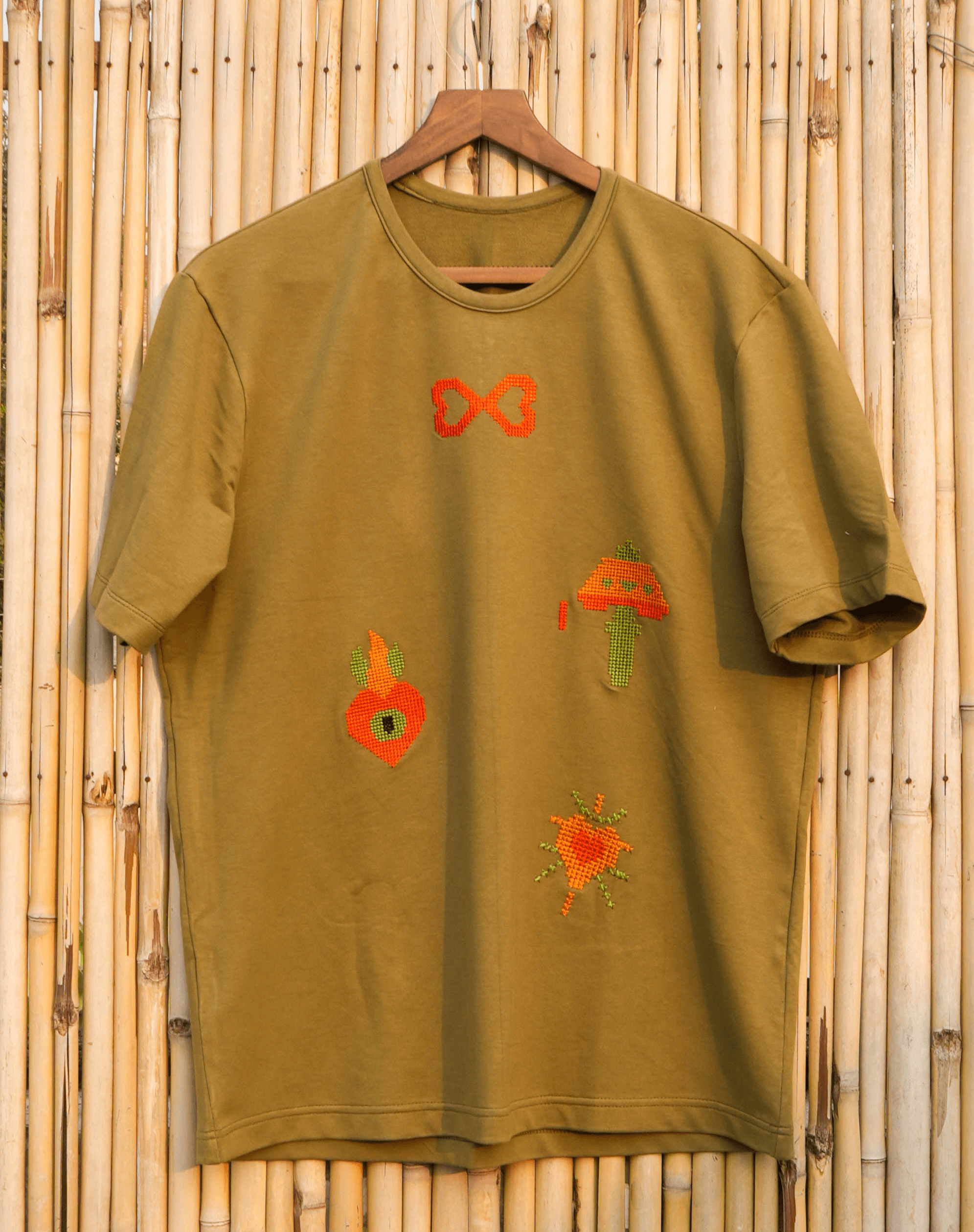 Artisans shaped a relaxed, easy-wear silhouette and mapped the placement of the motifs for balance and symbolism. The layout allows the tee to feel minimal yet emotionally rich.