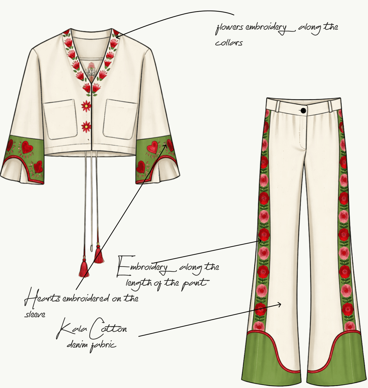 Artisans carefully brought the vision to life, working patiently with Kala cotton denim and embroidery to ensure each piece feels personal and handcrafted.